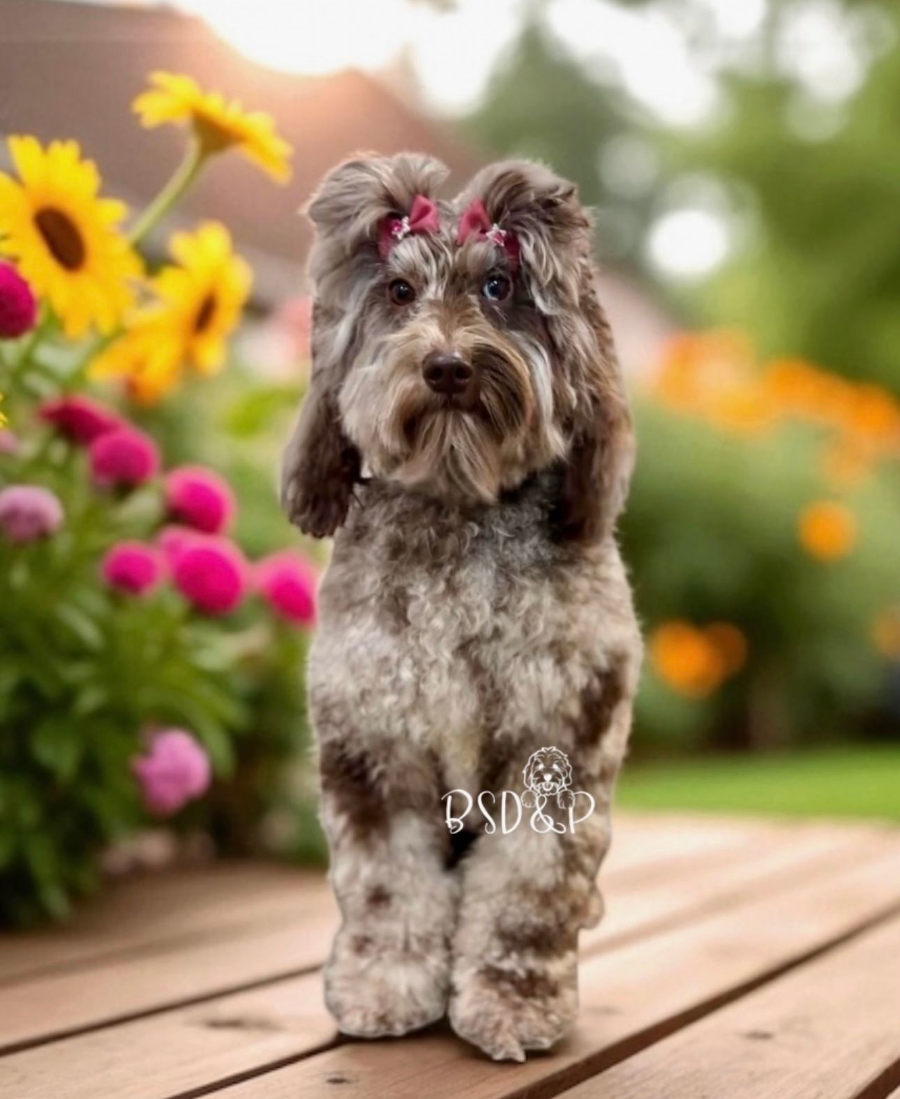 Mazie is a Multi Gen Mini Bernedoodle weighing 22 lb. She is 40% Bernese, which is a huge accomplishment with her genetics. She is a blue merle tri color and she carries for brown. She has a lovely plush wavy coat that is crazy soft. Mazie loves to cuddle and soak up all the attention that she can.